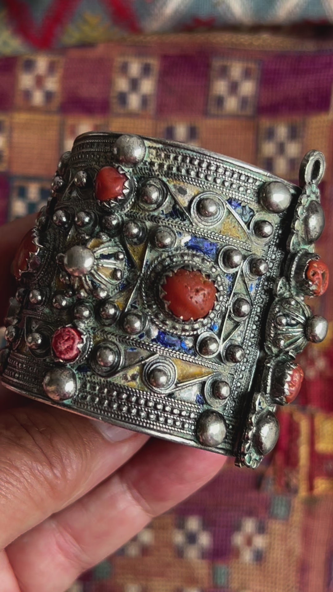 Ce bracelet manchette berbère à charnière émaillé est très ancien. Provenant de la Grande Kabylie en Algérie. Vers 1950. Excellente facture. Objet de collection. Ce bracelet est en argent avec émail cloisonné polychrome et cabochons de corail rouge naturel de Méditerranée.