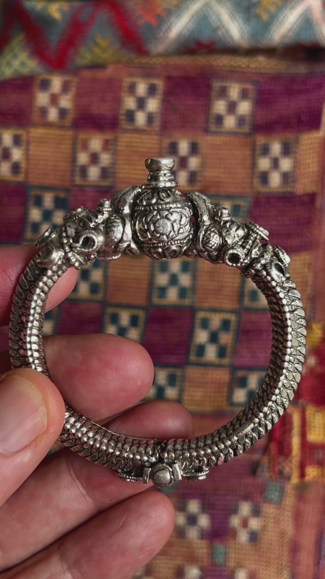 The bracelet is decorated with 2 Makara heads (a mythical Indian animal) whose wide open mouth is biting a sphere (magic bead).