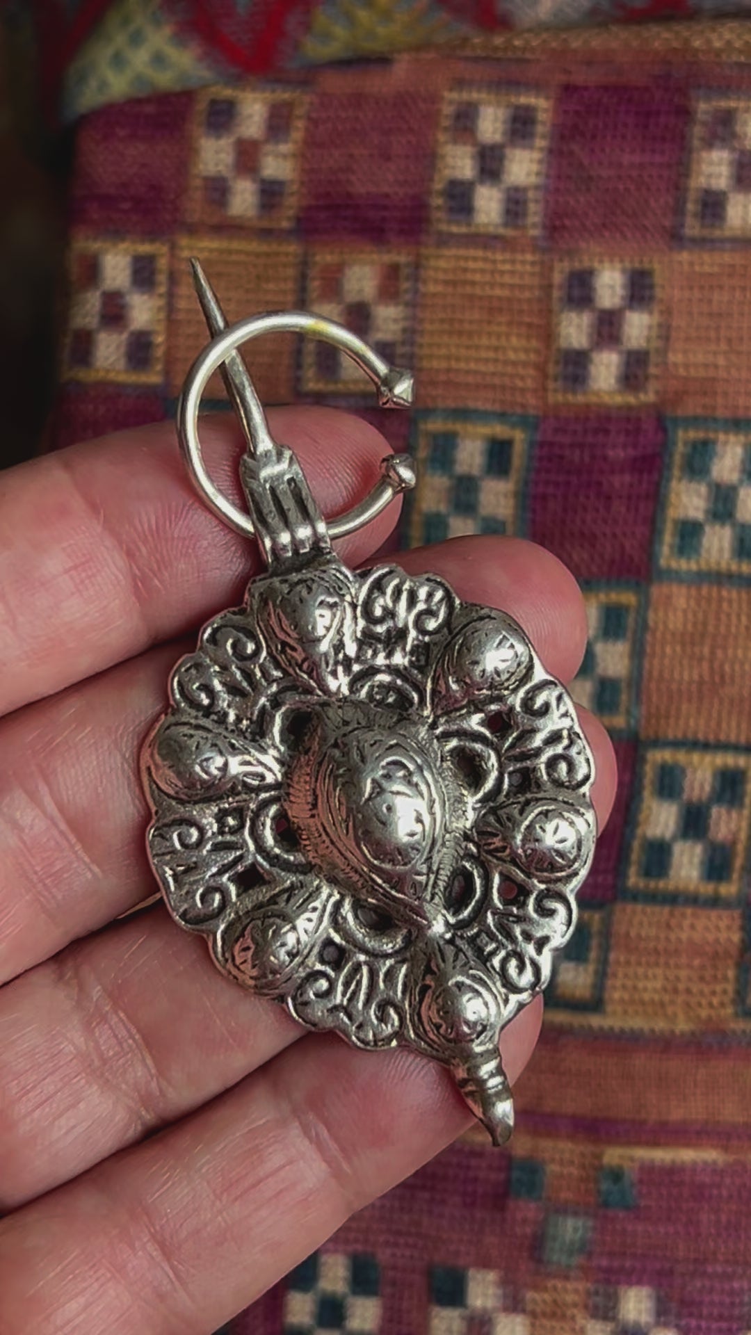 This delicate silver fibula comes from Morocco. It is egg-shaped. The protuberance in the centre is reminiscent of an almond. Around the almond are 6 petals separated by flat areas decorated with symbols that appear to be rams' heads.
